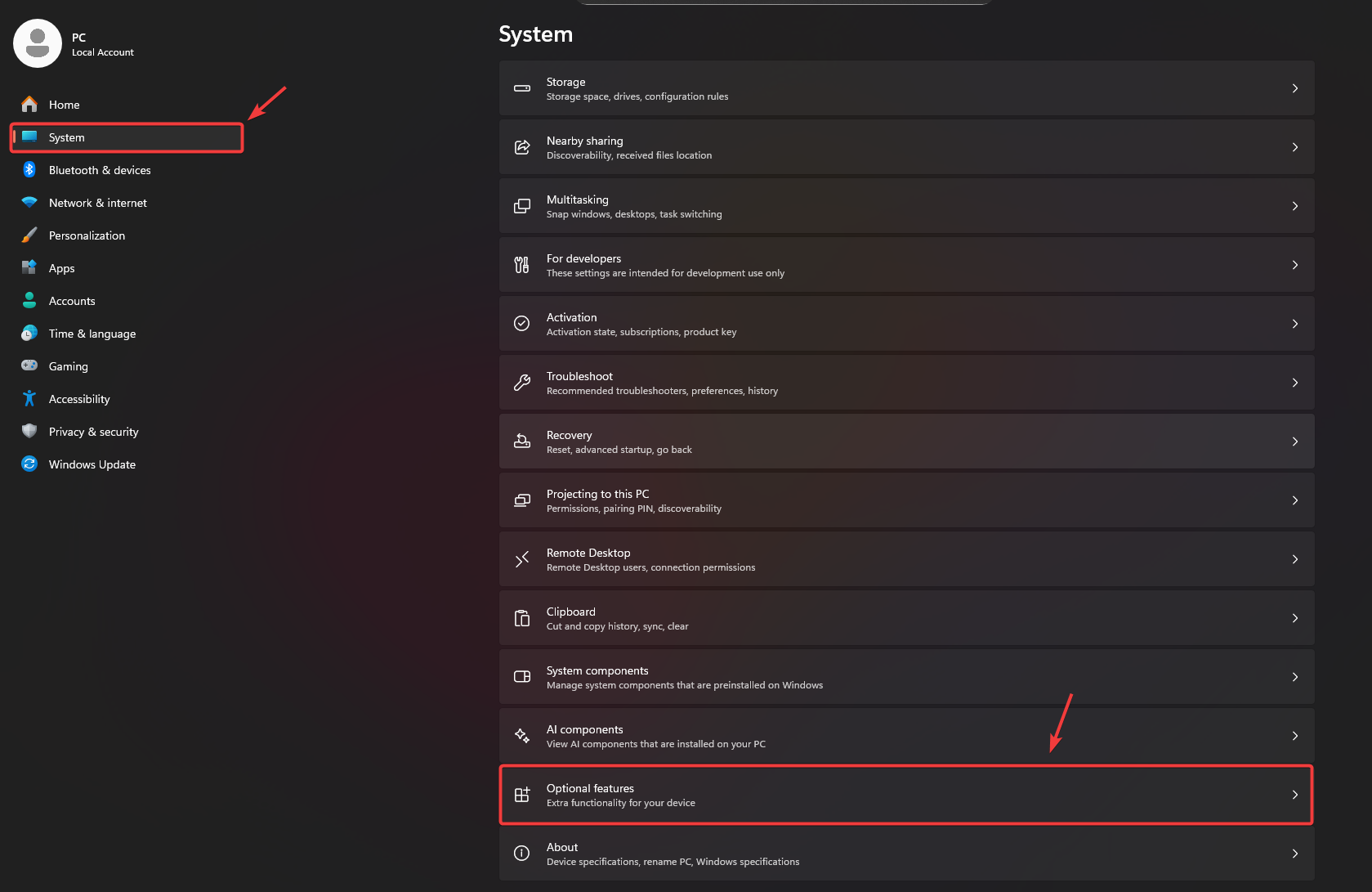 تحذير: يتطلب تثبيت الميزات الاختيارية إعادة تشغيل النظام. احفظ عملك قبل المتابعة.