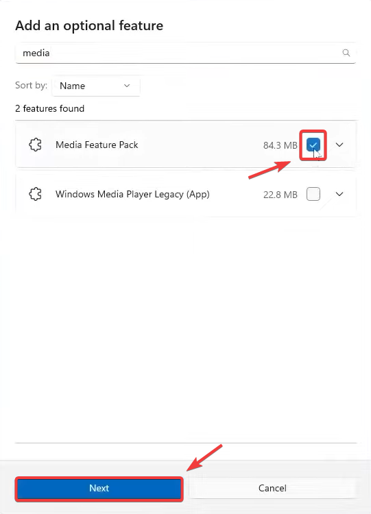 - ابحث عن Media Feature Pack، حدده، انقر على التالي، ثم انقر على إضافة.