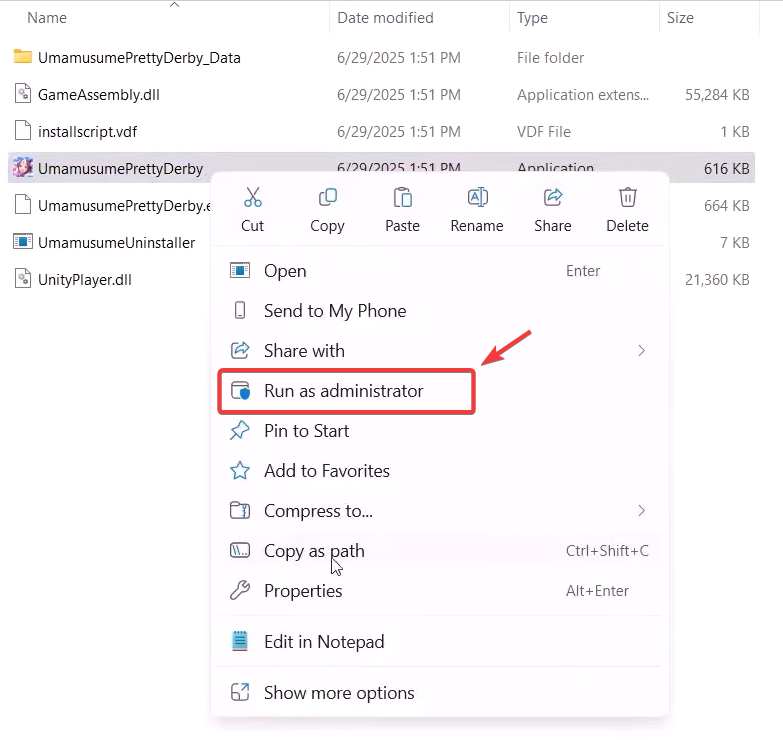 - حدد موقع الملف التنفيذي للعبة (عادةً umamusume.exe).