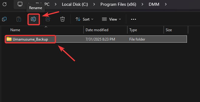 - انقر بزر الماوس الأيمن على المجلد المسمى Umamusume، وحدد إعادة تسمية، وغيّر الاسم (على سبيل المثال، Umamusume_Backup).