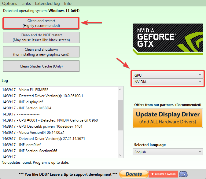 إذا ساعدت الطريقة الأولى (أو كنت تشك في برنامج التشغيل)، فقم بإعادة تثبيت نظيفة. يزيل DDU البقايا التي قد تفوتها عمليات إلغاء التثبيت العادية.