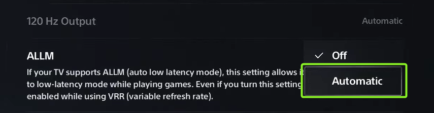 - مرر لأسفل للعثور على إعداد ALLM (وضع الكمون المنخفض التلقائي) وقم بتمكينه. يؤدي هذا إلى تنشيط وضع اللعب على الشاشات المدعومة، مما يقلل من تأخر الإدخال لتجربة أكثر استجابة.