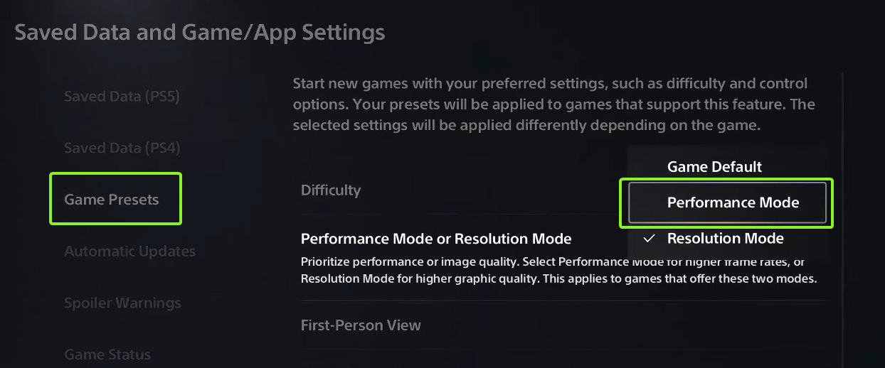 - افتح الإعدادات المسبقة للألعاب من الشريط الجانبي، ثم اختر وضع الأداء ضمن وضع الأداء أو وضع الدقة. يعطي هذا الأولوية لمعدل الإطارات على جودة الرسومات، مما يضمن حركة أكثر سلاسة أثناء اللعب.