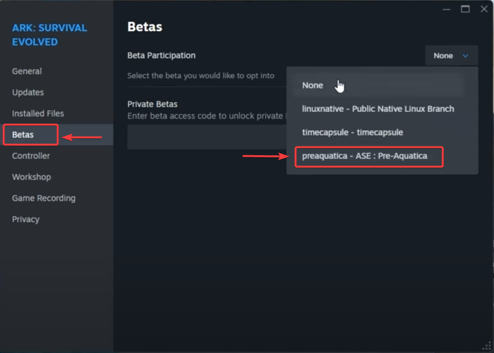 مؤخرًا، أثرت مشكلة توافق ناتجة عن تحديث على العديد من اللاعبين. تعطلت العديد من التعديلات (mods) بسبب تحديث Aquatica، مما قد يتسبب في تعطل اللعبة أو فشلها أثناء بدء التشغيل. (إذا كنت تستخدم Steam Workshop mods، فإنه يتم إدارتها عادةً من خلال ARK’s Workshop page on Steam.) يؤدي اختيار خيار البيتا “preeaquatica ASE” أو “لا شيء” إلى إعادة اللعبة إلى إصدار أكثر استقرارًا، مما قد يحل مشكلات التشغيل التي يسببها التحديث الجديد.