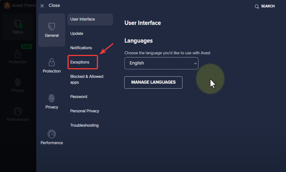 - ابحث عن خيارات الاستثناءات، أو المستثنيات، أو قائمة السماح.