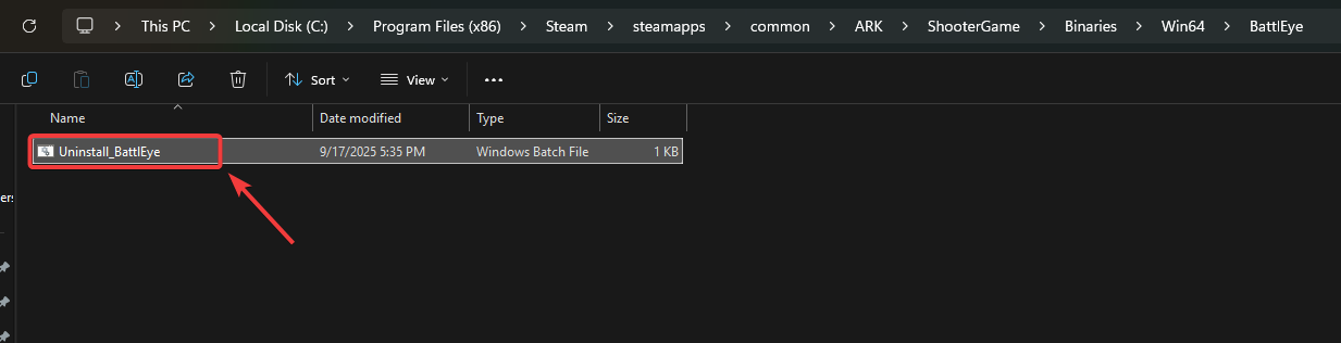 - حدد موقع الملف المسمى Uninstall_BattlEye.bat.