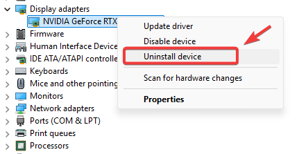 - انقر بزر الماوس الأيمن على بطاقة الرسوميات الخاصة بك (NVIDIA أو AMD أو Intel) ثم اختر إلغاء تثبيت الجهاز.