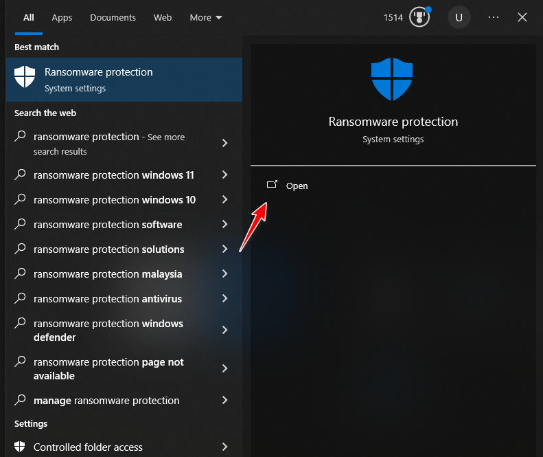 - ابحث عن “Ransomware Protection” في شريط بحث Windows وافتحه.