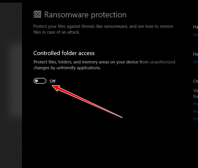 - قم بإيقاف تشغيل “Controlled folder access”.