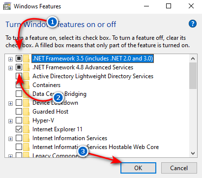 - قم بتمكين “.NET Framework 3.5” و “.NET Framework 4.8“، ثم انقر فوق موافق.