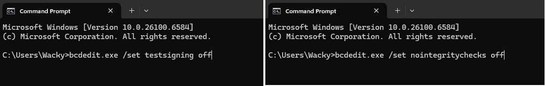 bcdedit.exe /set testsigning off bcdedit.exe /set nointegritychecks off