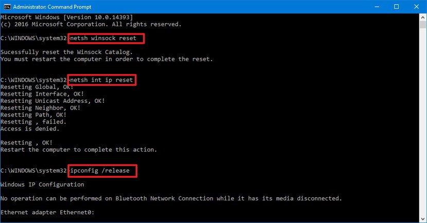 netsh winsock reset netsh int ip reset ipconfig /release ipconfig /renew ipconfig /flushdns