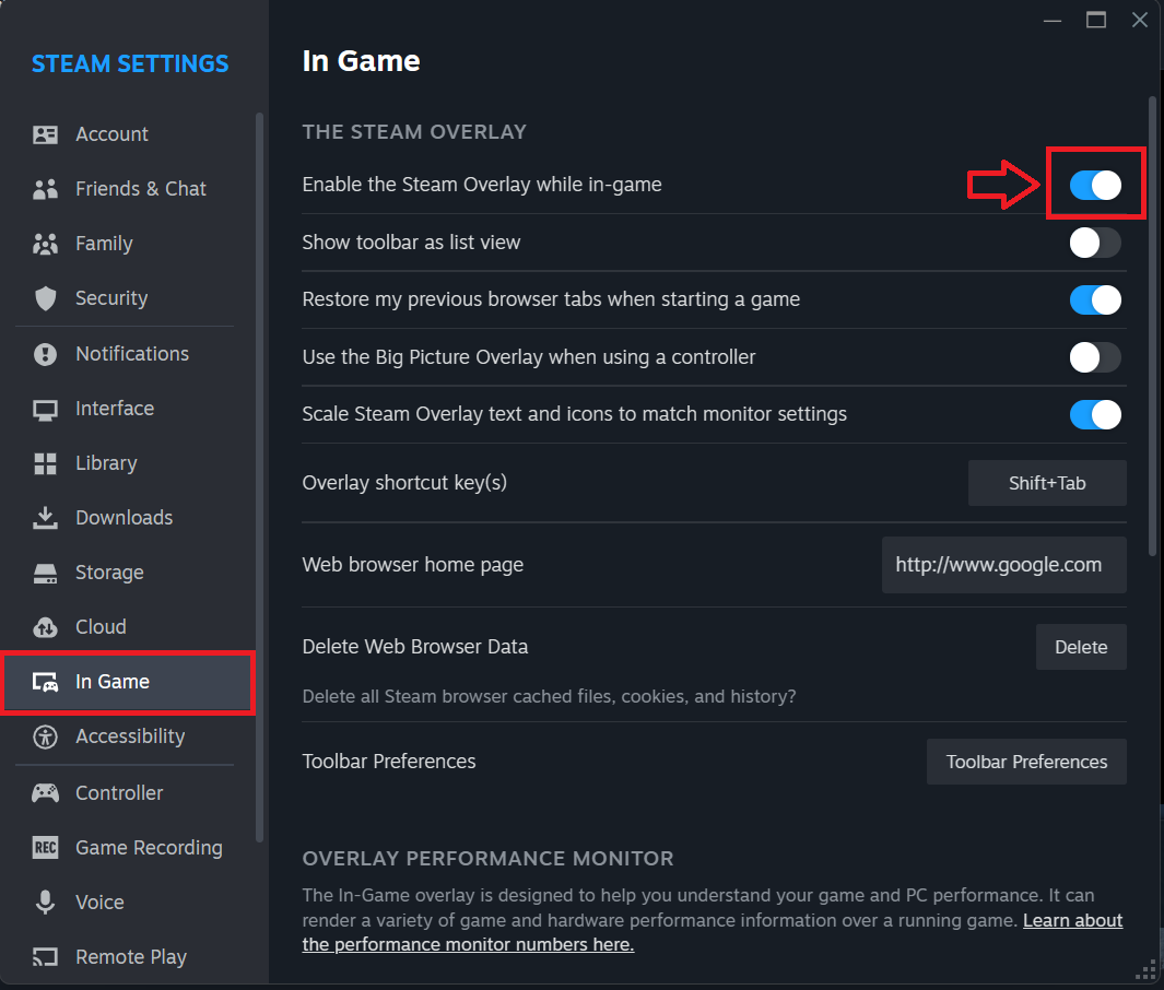 • Steam Overlay: Steam > Settings > In-Game > تعطيل Enable the Steam Overlay while in-game.