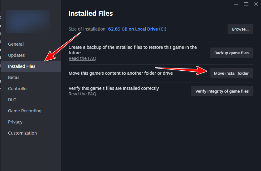 3. انتقل إلى الملفات المثبتة > نقل مجلد التثبيت.