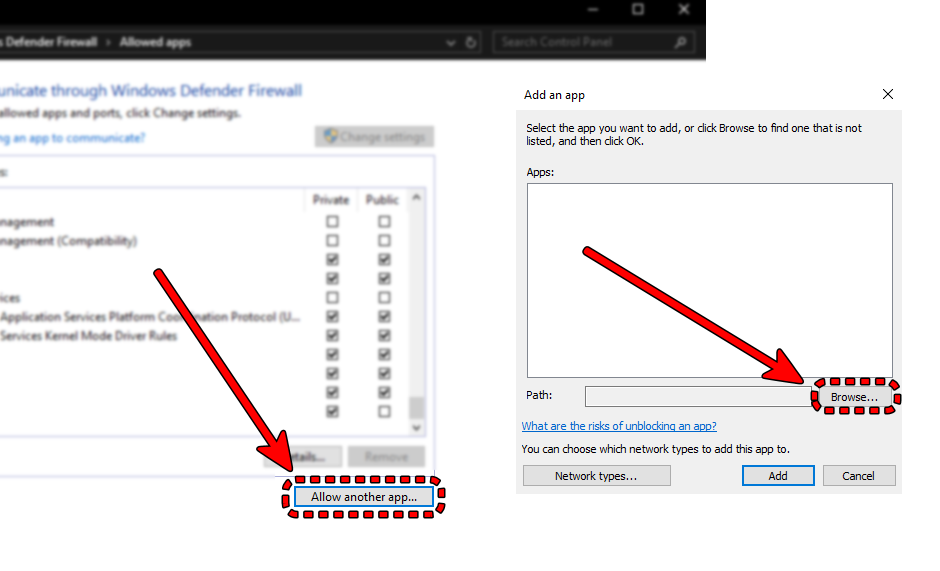 - إذا لم تكن مدرجة، فانقر فوق “السماح لتطبيق آخر…”، ثم استعرض للوصول إلى مجلد اللعبة، وأضف كلاً من