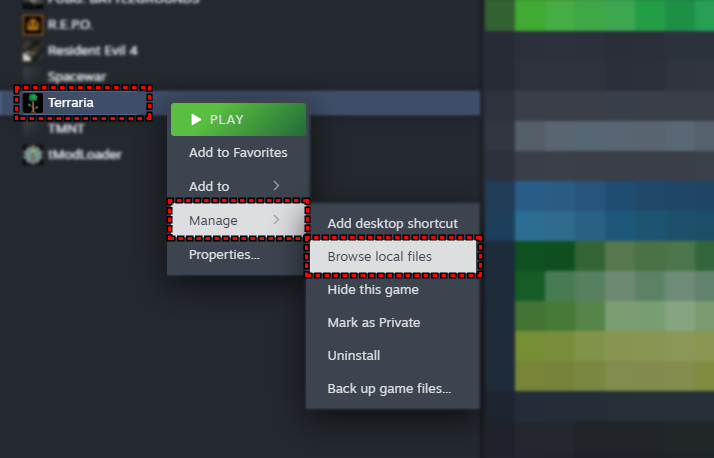 - انقر بزر الماوس الأيمن على Terraria في مكتبتك (Library).