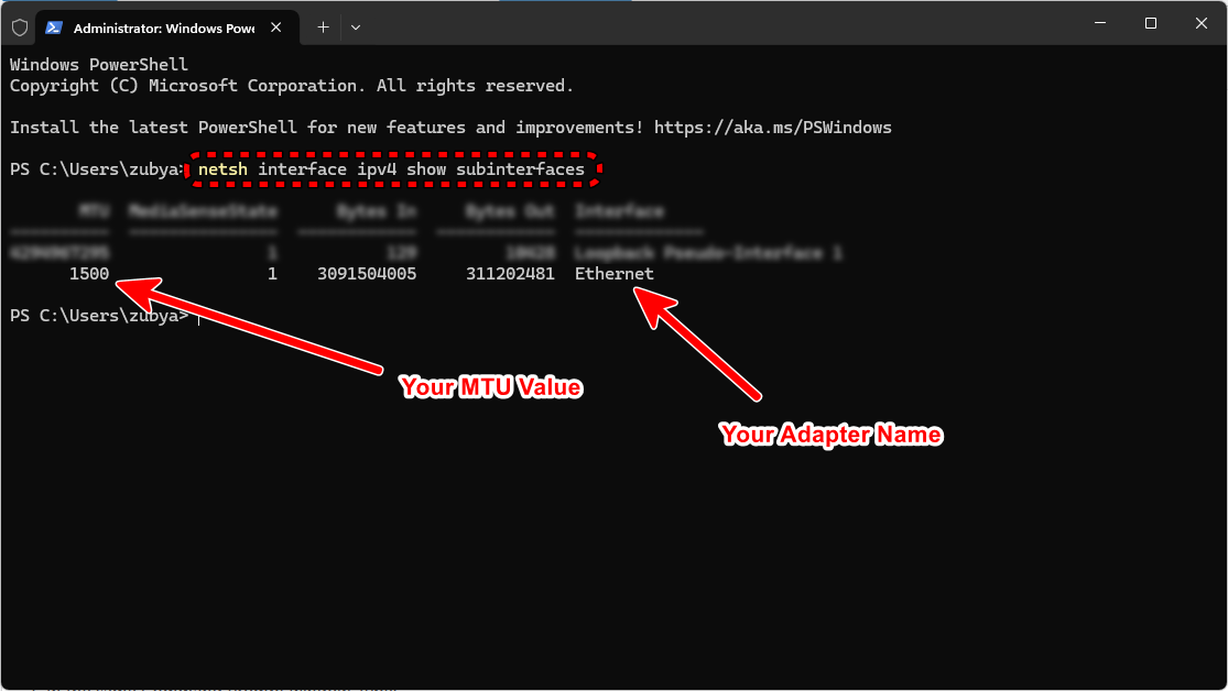 الخطوة 1: التحقق من قيمة MTU الحالية