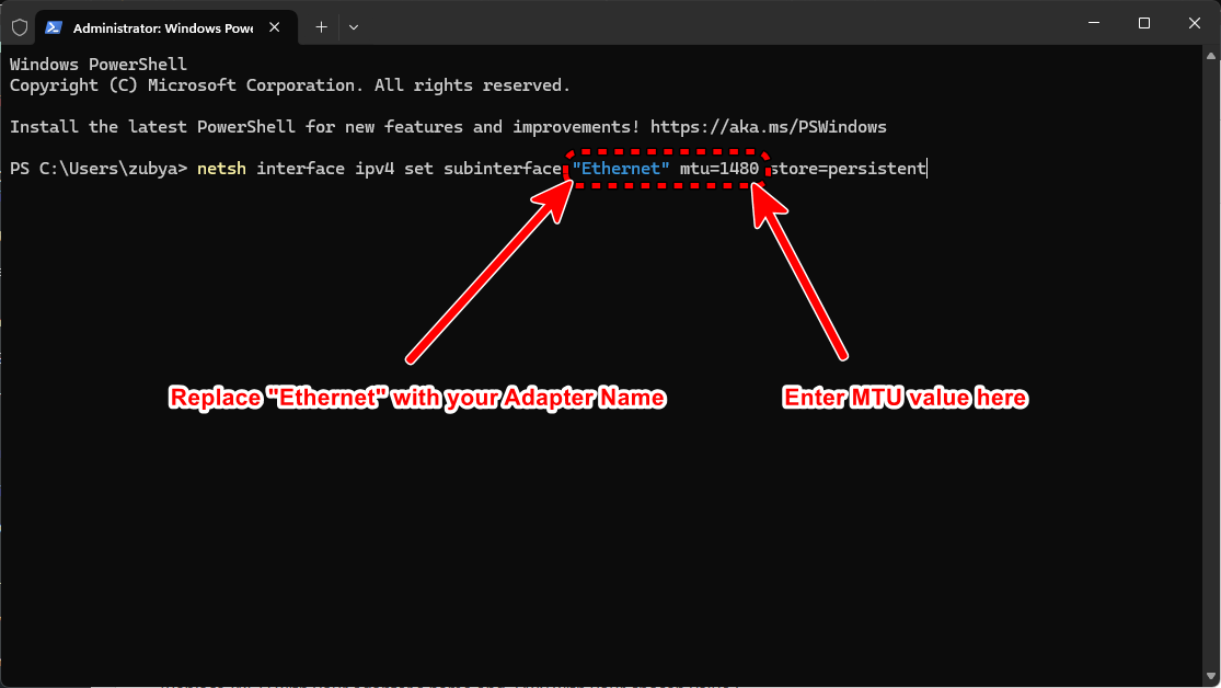 netsh interface ipv4 set subinterface "Wi-Fi" mtu=1480 store=persistent