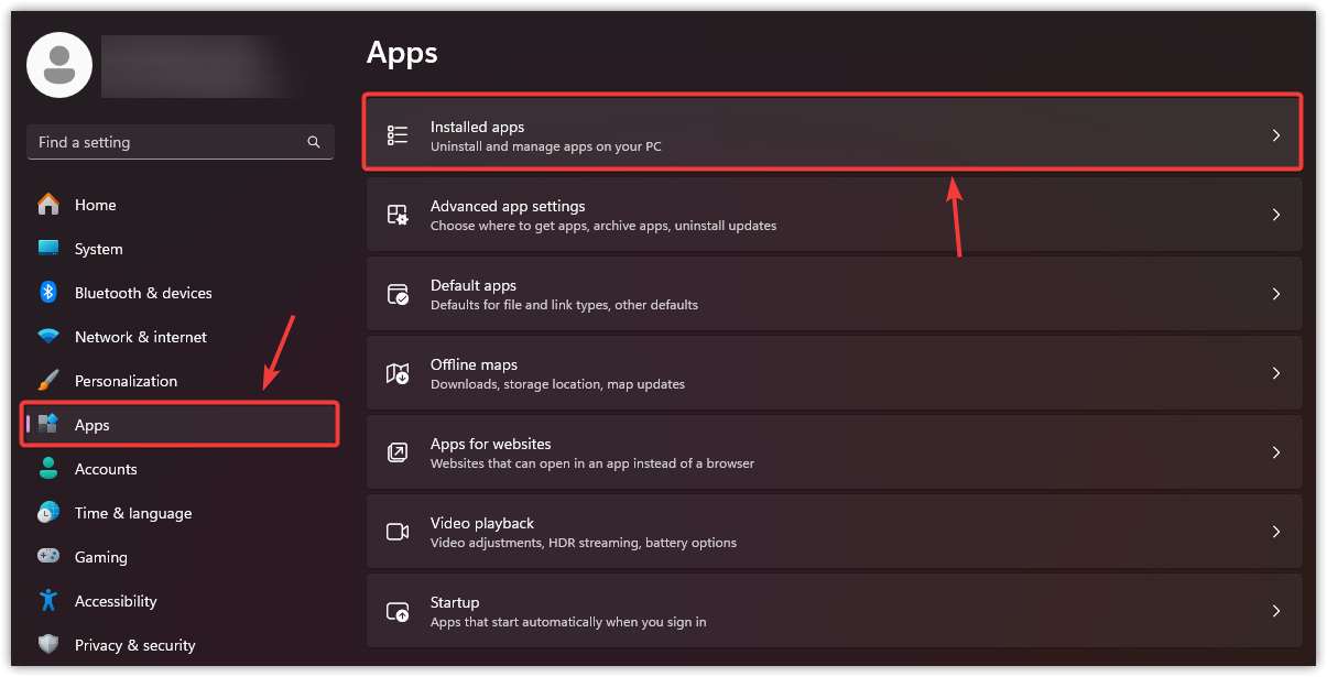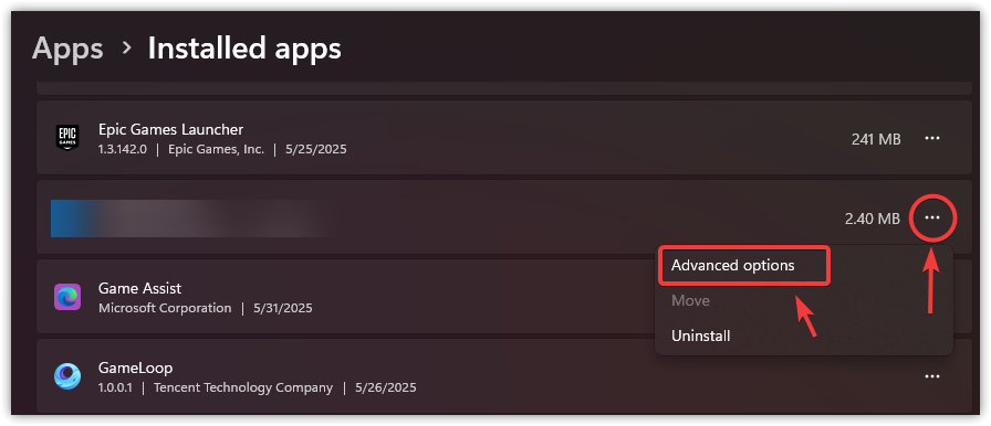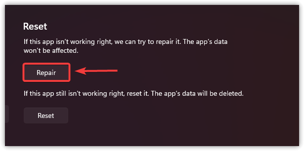 - إذا كان خيار Repair غير متاح أو غير فعال، ارجع إلى قائمة Apps.