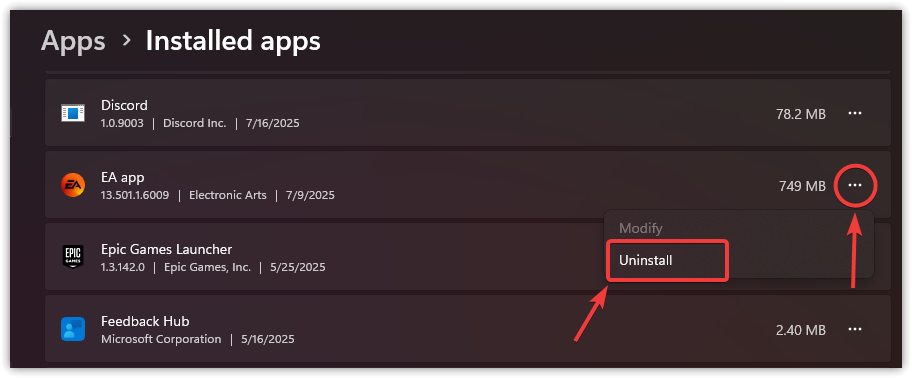 - انقر على النقاط الثلاث بجانب EA App واختر Uninstall.