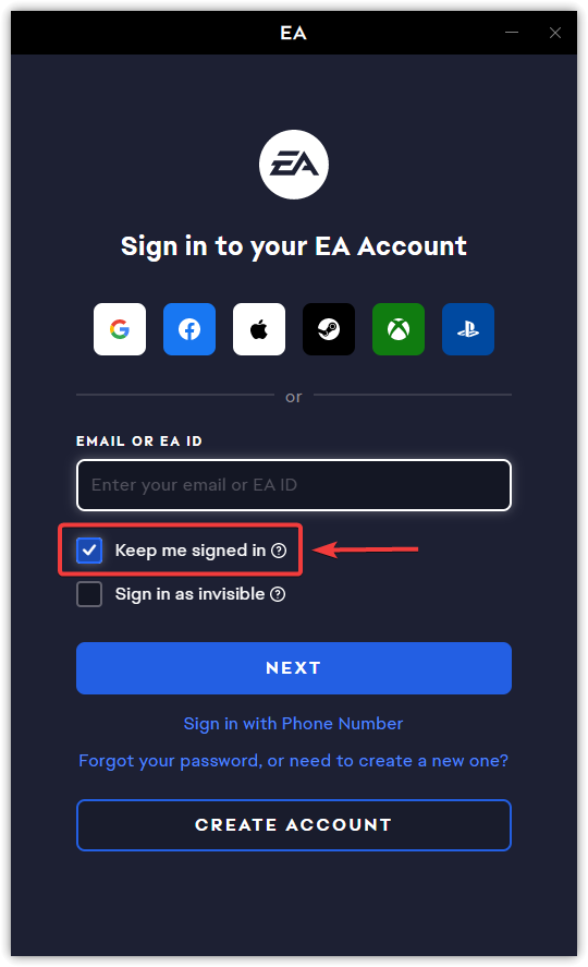 3. تسجيل الدخول إلى EA.com وتفعيل “Keep Me Signed In”