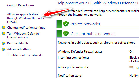 - انقر على السماح لتطبيق أو ميزة بالمرور عبر جدار حماية Windows Defender.