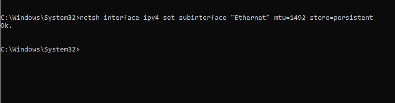 netsh interface ipv4 set subinterface "Ethernet" mtu=1492 store=persistent