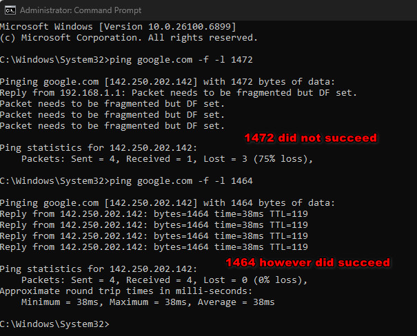 - بمجرد العثور على أعلى قيمة تنجح، أضف 28 للحصول على قيمة MTU الصحيحة.