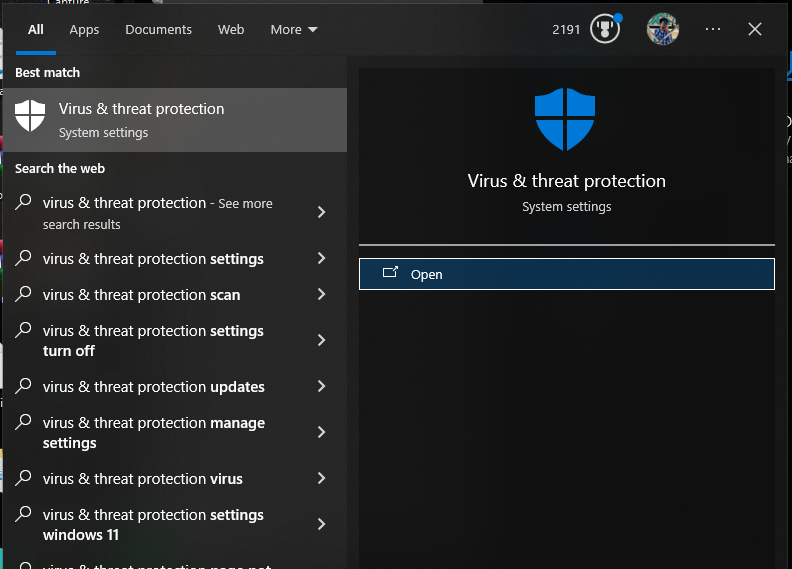 - افتح حماية من الفيروسات والمخاطر من شريط بحث Windows.