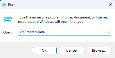 2. اضغط على Win + R، واكتب C:ProgramData، ثم اضغط على Enter.