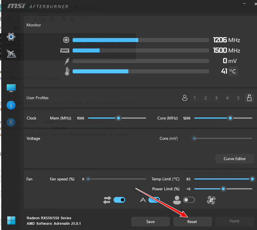 1. إذا كنت تستخدم MSI Afterburner (أو ما شابه ذلك)، افتحه وانقر على Reset (إعادة الضبط).