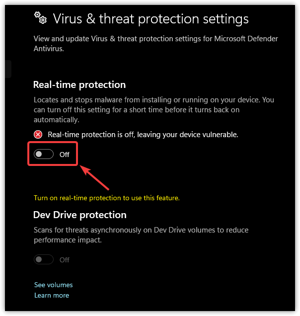- قم بإيقاف تشغيل الحماية في الوقت الحقيقي.