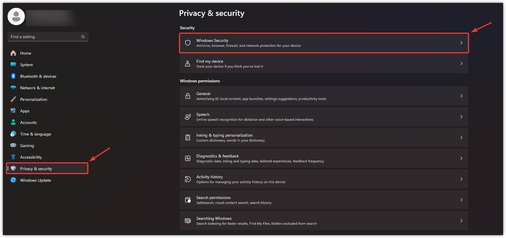 - انقر فوق الخصوصية والأمان على اليسار، ثم حدد Windows Security.