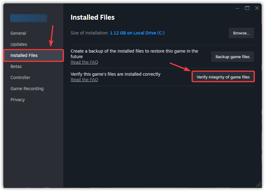 - اذهب إلى علامة التبويب الملفات المثبتة وانقر على التحقق من سلامة ملفات اللعبة.