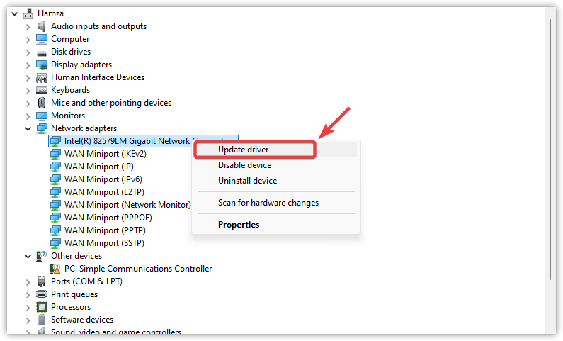 3. انقر بزر الماوس الأيمن على محول الشبكة النشط لديك واختر تحديث برنامج التشغيل.