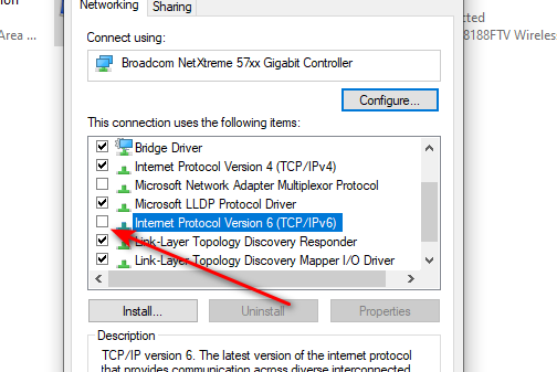 - مرر لأسفل إلى بروتوكول الإنترنت الإصدار 6 (TCP/IPv6) وألغِ تحديد المربع الخاص به.
