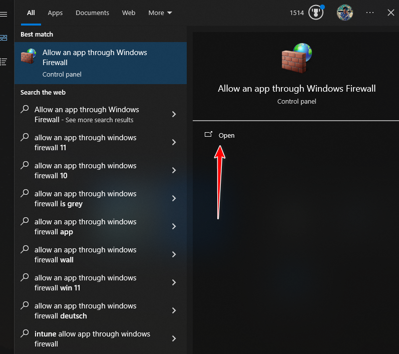 - ابحث عن السماح لتطبيق بالمرور عبر جدار حماية Windows وافتحه.