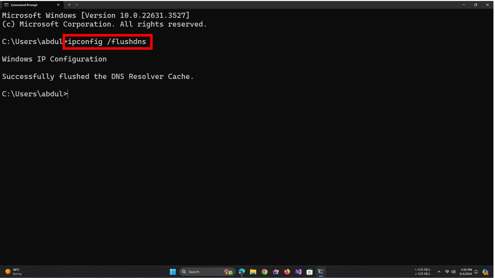 - سترى رسالة تؤكد أنه تم مسح ذاكرة التخزين المؤقت لنظام أسماء النطاقات (DNS) بنجاح.