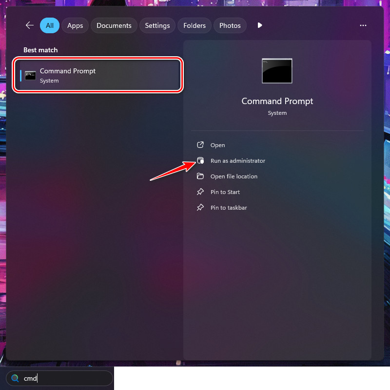 - اضغط على Windows + S، واكتب cmd، ثم انقر بزر الماوس الأيمن على موجه الأوامر وحدد تشغيل كمسؤول.