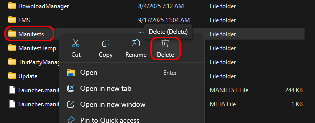 - ابحث عن المجلد المسمى Manifests، وانقر عليه بزر الماوس الأيمن، ثم حدد Delete.