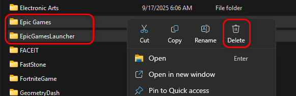 - حدد موقع المجلدين Epic Games و EpicGamesLauncher واحذفهما.
