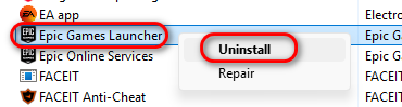 - ابحث عن Epic Games Launcher في القائمة، ثم انقر بزر الماوس الأيمن عليه، واختر إلغاء التثبيت.