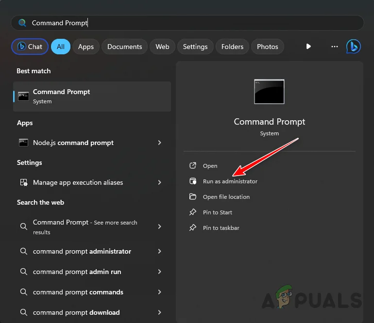 - ابحث عن Command Prompt (موجه الأوامر) واختر Run as administrator (تشغيل كمسؤول).