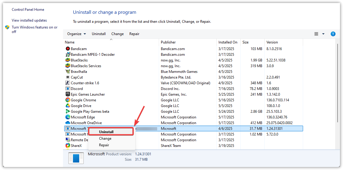 - انقر بزر الماوس الأيمن على كل إدخال من إدخالات Microsoft Visual C++ Redistributable واختر إلغاء التثبيت (Uninstall).