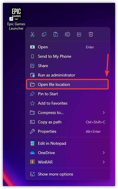 - حدد موقع رمز Epic Games على سطح المكتب، وانقر بزر الماوس الأيمن فوقه، وحدد فتح موقع الملف.
