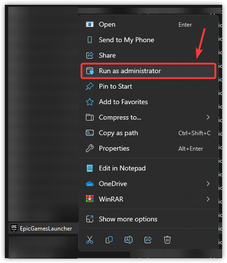 - في المجلد الذي يفتح، انقر بزر الماوس الأيمن فوق EpicGamesLauncher.exe وحدد تشغيل كمسؤول.