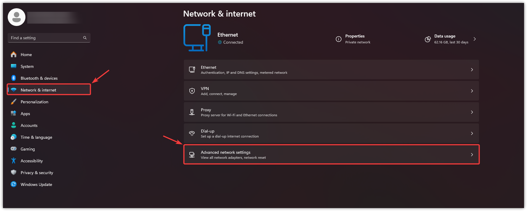 - انقر على الشبكة والإنترنت وحدد إعدادات الشبكة المتقدمة.