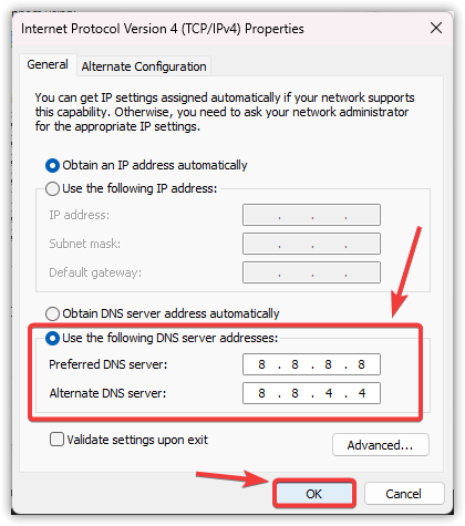 Preferred DNS server: 8.8.8.8 Alternate DNS server: 8.8.4.4