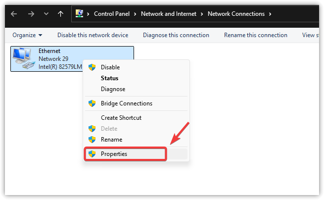 - انقر بزر الماوس الأيمن على اتصال الإنترنت الخاص بك واختر خصائص.