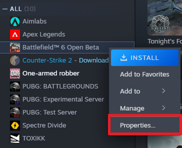6. انقر بزر الماوس الأيمن على Battlefield 6 في مكتبة Steam الخاصة بك > الخصائص.